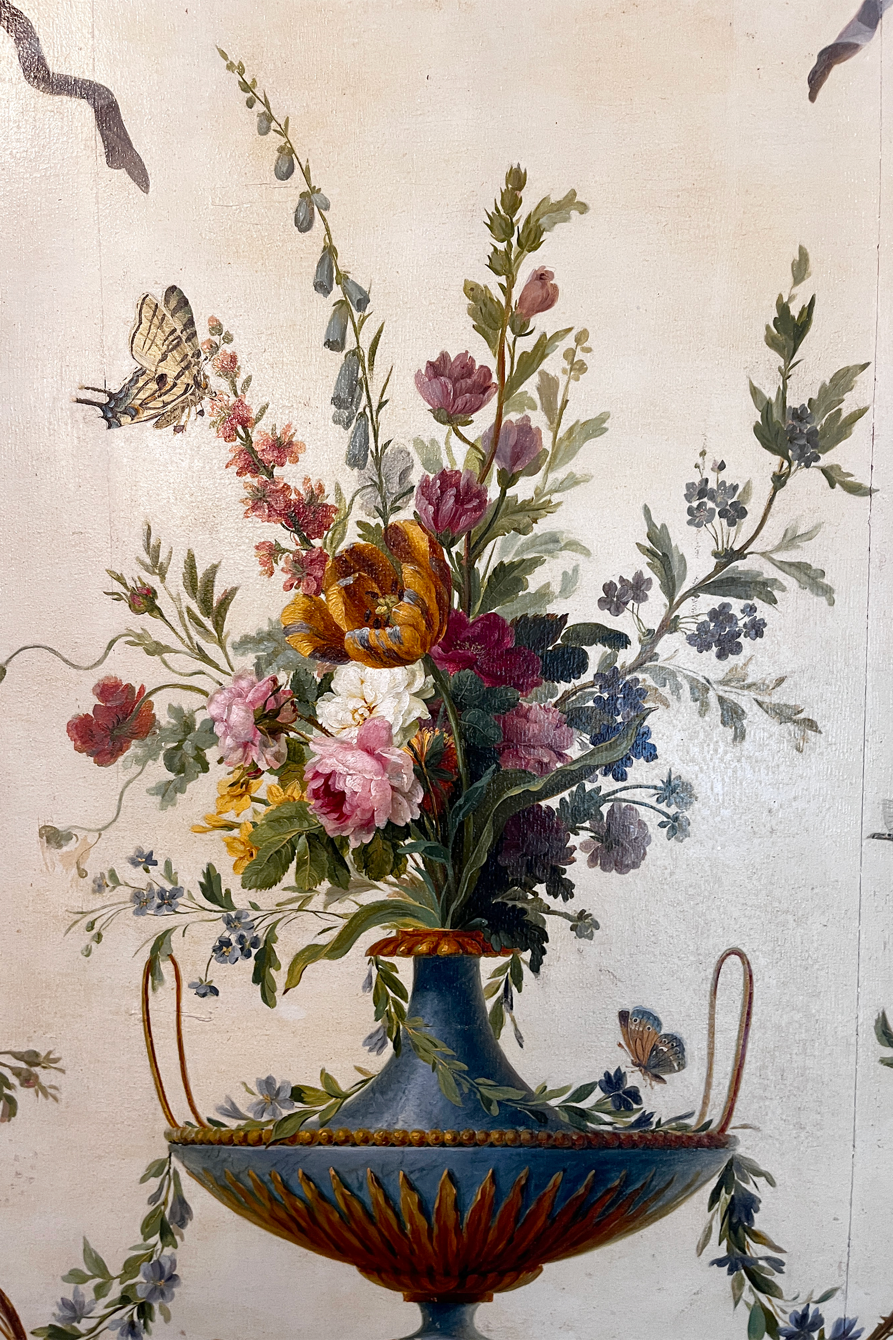 This lavish floral arrangement, set against a light background, bursts with vibrant colors. The flowers showcase rich pinks, deep burgundy, soft whites, and sunny yellows. The greenery features a variety of lush greens, from emerald to olive. Old-world opulence meets timeless chique.