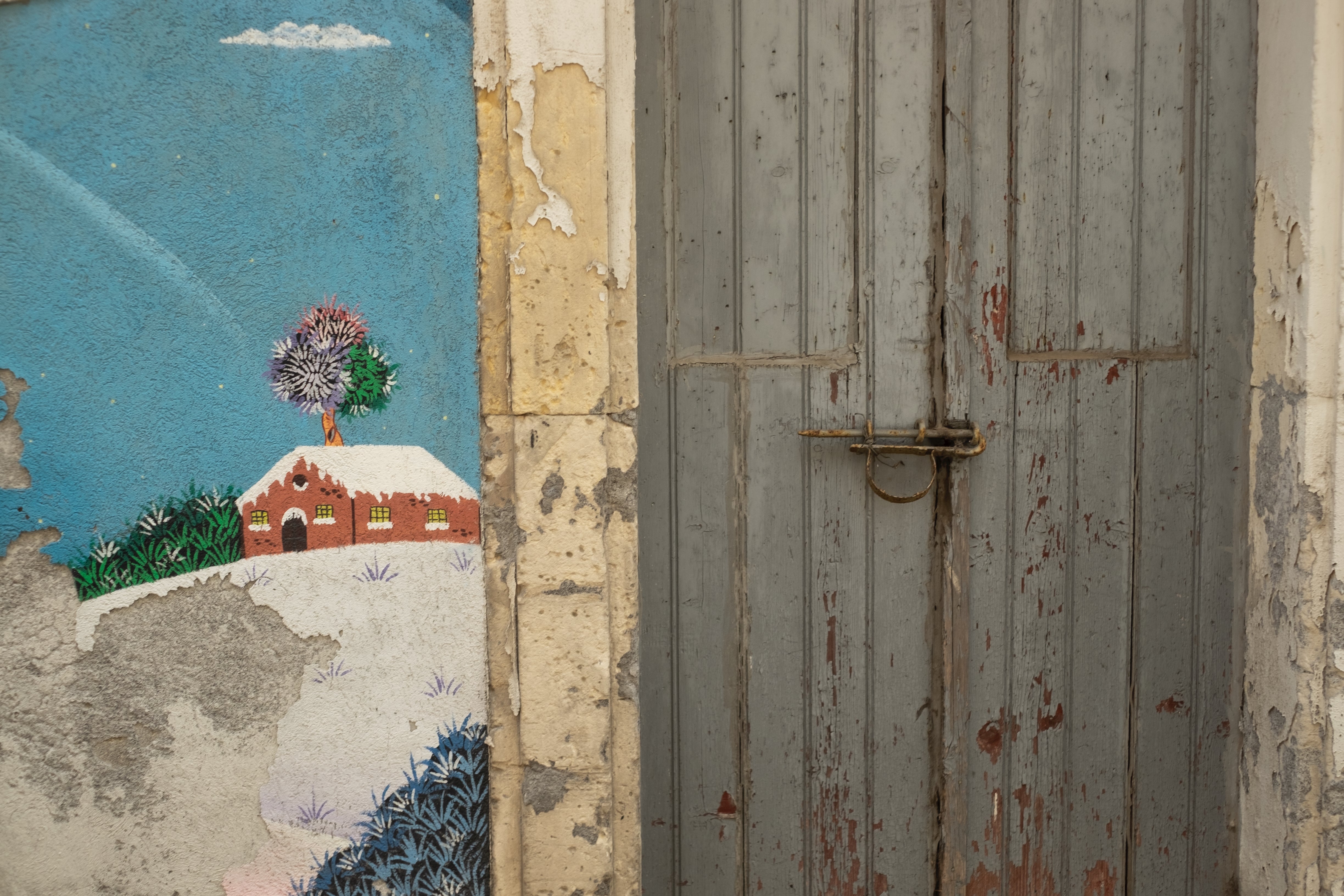 This painted scene, more suited for a windswept wall in the mountains, unexpectedly adorns a corner in the sun-drenched town of Lingualosa, Sicily. How did it get here? A nostalgic tourist from the North longing for alpine vistas? Maybe a Sicilian native daydreaming of snow-covered peaks and a white Christmas? A curious contrast to its Mediterranean home.