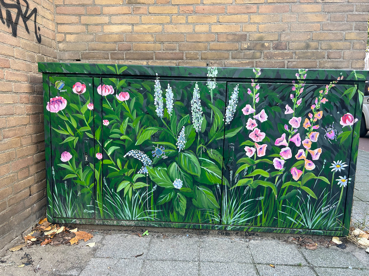 In a quiet residential stretch of Rotterdam, where brick and pavement tend to repeat themselves, an electrical cabinet is gently overtaken by green. Lianes climb across the metal surface like a borrowed jungle — layered greens, soft pinks, pale blossom whites unfolding with an unforced generosity. This is not strangling growth, but an invitation: colour stepping forward, leaves opening space, tiny beetles appearing as small signatures of attention, each with a name. Utility becomes habitat. Infrastructure turns ornamental without irony. A grey corner learns how to breathe, and the everyday picks up a pulse of green it didn’t know it was missing.